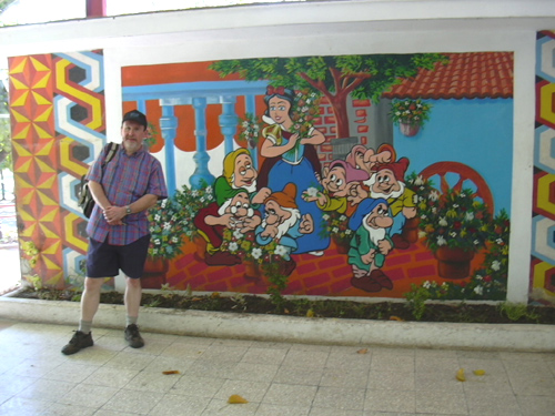Jim at the entrance of the Moncada Barracks, which Fidel and his guerrillas attacked Batista's men in July of 1953. It was one of the early efforts of Castro's takeover, and was so unsuccessful that things were put on hold for 3 1/2 years. The bullet holes are faked, although supposedly fairly representational. The building is now a museum and a school.