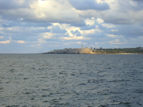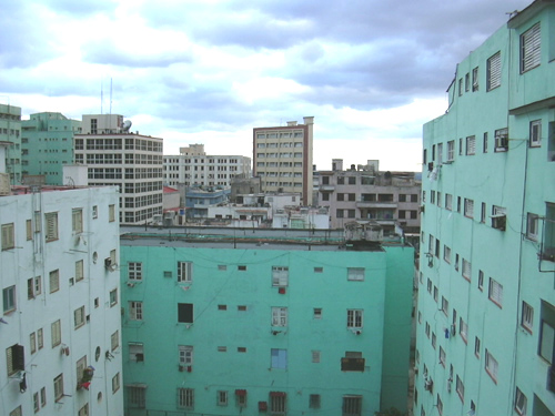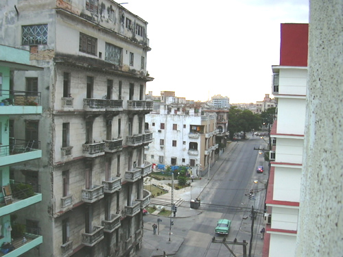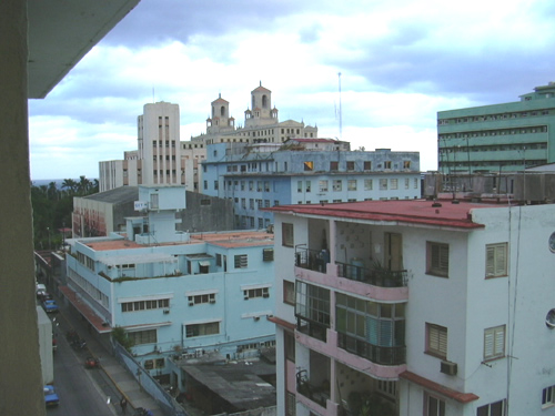 The Hotel Vedado, where we stayed. Looks much nicer on the inside! The lobby, where a nice traditional Cuban son band named 'Carenas' played every night. Note the internet computers behind them. Jim's on the left. He did a good interview with one of the band members. What you collect in your hotel room: batteries, bananas, red wine, bottled water, minidisc player in a ziploc bag, cheezies, limes, a bathing suit ... Jim at Il Mercado, picking up the essentials - wine and cheezies. We bought a lot of bottled water there too. A bottle of 3 year old rum was 5 1/2 covertable pesos [ie US dollars] Out walking on the malecon - you could see El Morro castle way over on the other side of the bay. The Hotel Nacional, taken from the Malecon - sort of Havana's Hotel Vancouver, or Royal York. Very old and very beautiful. And you could get cash advances with your Visa card there on the weekends! The view out our hotel window to the north - you can see the twin towers of the Hotel Nacional. The view out our hotel window to the west, more or less. The view out our hotel window to the south, towards the Mercado that we patronized.