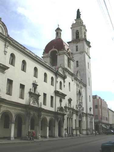 Very nicely restored Pontiac taxi. Marcial would be envious! Out our hotel window again, we see what appears to be a day care centre or something like that. An outdoor market on Calle Tacon started off our day in Habana Vieja [Old Havana]. This painting depicts cans of Revolution, History, Ideology, Landscape, Migration and Baseball Soup. We did the Lonely Planet Walking Tour of Old Havana, starting with the Catedral de San Cristobal de la Habana. The tables on the left are the outdoor portion of the El Patio restaurant. Jim and Ruth Kozak in front of the cathedral. [Ruth came to Havana for the Jazz Festival, and was staying at the Vedado. Turned out she lived near the Drive in Vancouver, mere blocks from Paul.] Looking inside the cathedral Inside the cathedral looking out Inside the cathedral Stogie-smokin' Cuban on the cathedral steps 'The 'Okay Cuba' band playing at the El Patio Restaurant, still in the plaza in front of the cathedral. Flower girls at the El Patio 'Okay Cuba' band, complete with gogo dancer. Note the cigar she's wielding in her left hand